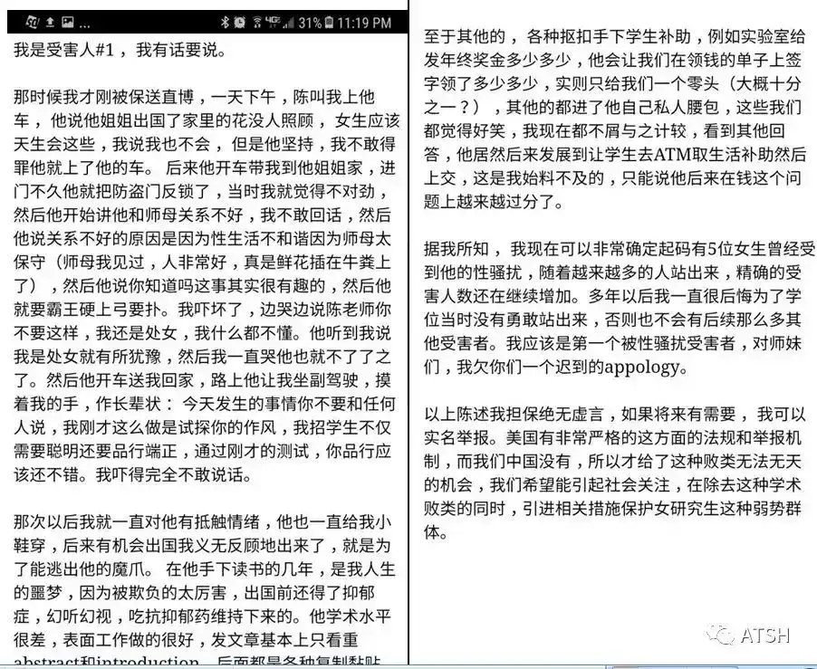 1月2日,罗茜茜在微信公众号ATSH上公布北航女生D的证词。据罗茜茜所言,除了她自己之外,涉及此事的受害女生目前至少有五位,她在文中呼吁更多受害女生站出来。