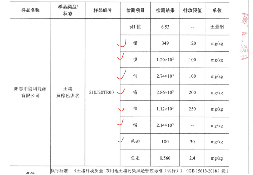 2020年1月,当地村民自己掏钱,检测阳春沙河村铜泥的铜镍PH含量,发现镍含量超过浓度限值五倍。毫无疑问,这些铜泥是有毒的危险废物。2020年7月左右,阳春环保局委托华南环境检测中心技术人员到现场用光谱分析仪采样检测,发现采样铜泥样品中,铬、镍、铅、砷、铜重金属严重超标,最多达到十倍。