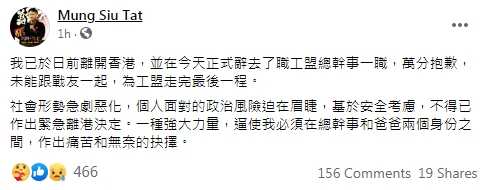 但当事情恶化到我可能有被捕的风险,需要从父亲和职工盟总干事这两个角色里面做抉择的时候,我才无奈做出一个痛苦的决定。但这不是说,我认为留下来的人没有更多有意义的事情可以做。